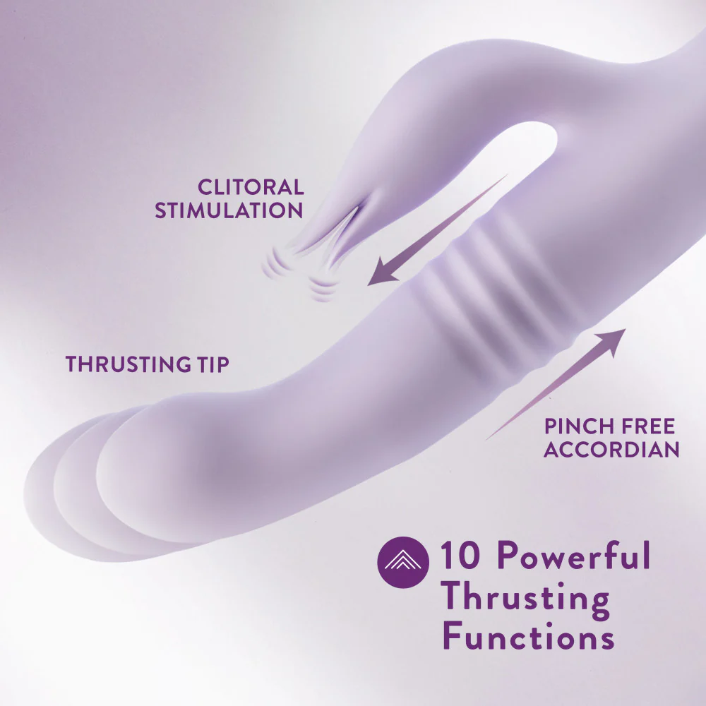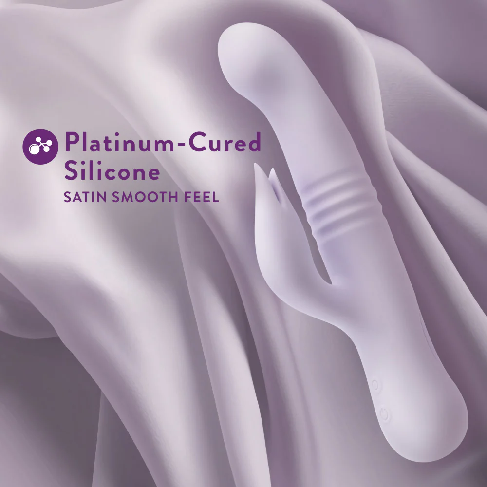 Introducing Rylee, the sleek and energetic rabbit vibrator that will Make The Bed Shake. With its elegant design, this dual stimulator offers a world of clitoral and G-spot sensations. Its rounded head is curved for comfortable insertion, featuring 10 powerful thrusting vibrations, with 3 progressive speeds & 7 creative patterns that passionately romances your G-spot.
